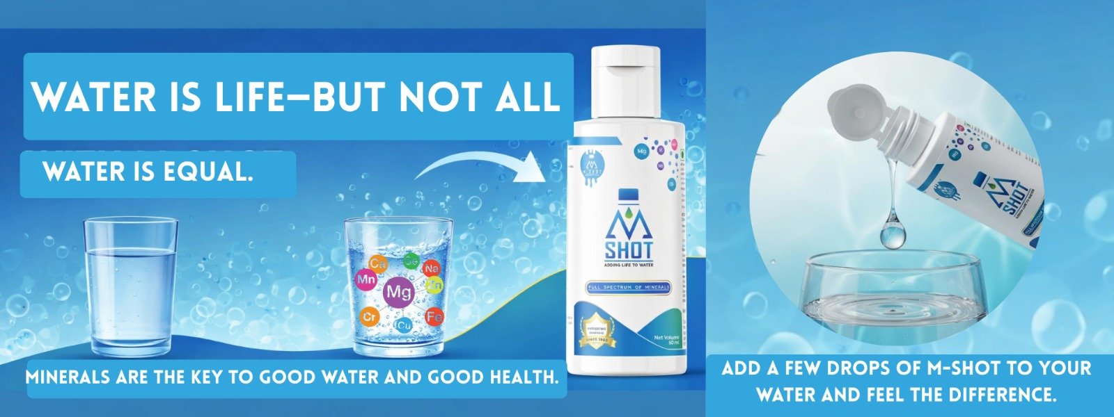 Add 20–40 drops of M-Shot concentrate into a glass or bottle of water, juice, or any beverage.